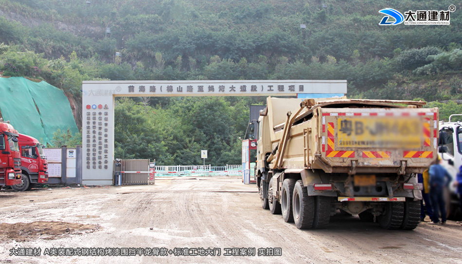 廣東省深圳市南山區前海路的棉山路至媽彎大道段工程項目使用了大通建材生產銷售的A類烤漆鋼圍擋2.5米高半龍骨款、圍擋基礎塊、標準工地大門等產品