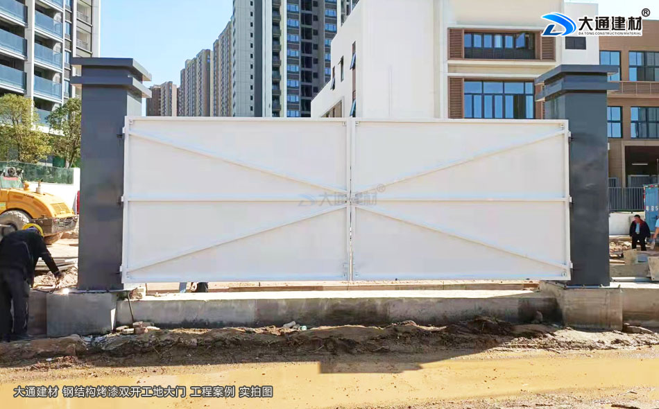 施工安全方案解決工程師,24小時在線等候您的咨詢!這個工程工地采用的是深圳大通建材生產的項目施工現場新款鋼結構烤漆工地大門,白色烤漆鋼材制作,雙開門加兩根霸氣大立柱,整個大門看起來很有氣勢吧。