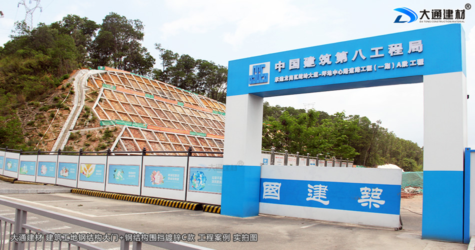 中國建筑八局集團(tuán)在深圳市龍崗區(qū)蛇嶺大道坪地中心路道路工程(一期)A段的工程項目,選用了深圳市大通建材生產(chǎn)的鋼結(jié)構(gòu)工地大門為項目部大門。