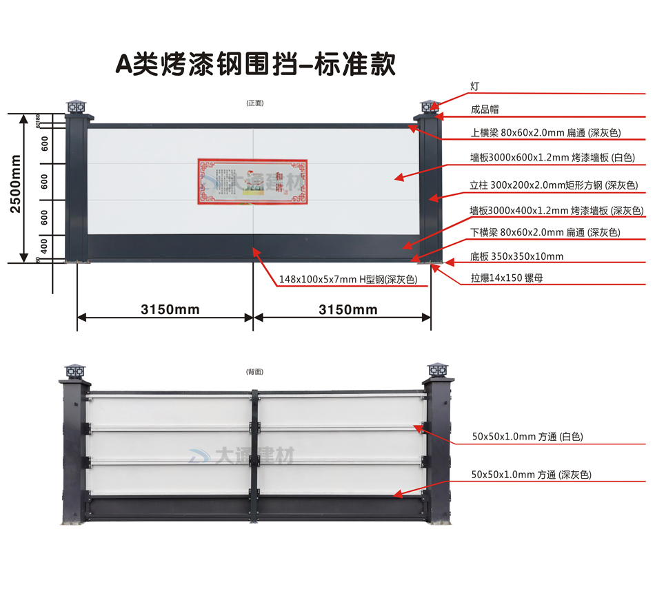 大通建材生產的施工圍擋成品規格尺寸:6.3米長x2.5米高 (其它尺寸的圍擋高度可按需定制)如下圖