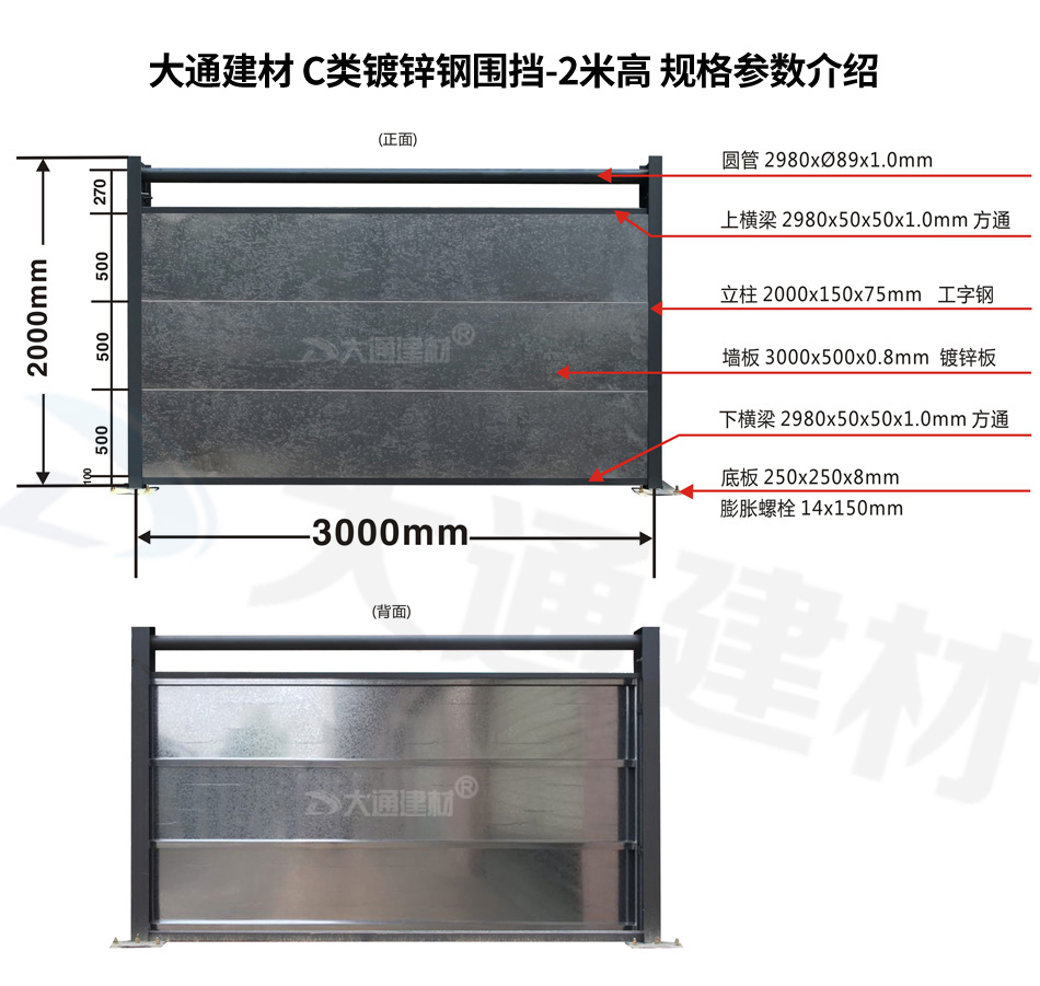 深圳大通建材C類裝配式鋼圍擋-鍍鋅板款通常作為圍墻護欄使用,起隔離防護作用。常規一擋的長度是3米、高度是2.4米和2.5米,若沒有特殊要求的項目工程按性價比來選擇鍍鋅鋼板圍擋款式建議是選擇鍍鋅鋼板圍擋c款的2.4米高的工字鋼立柱的普通款。如果對高度要求至少要2.5米高的工程,這種情況下建議使用H型鋼立柱鍍鋅鋼板圍擋c款。